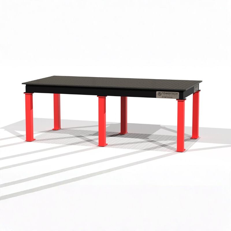 2D Modular Welding Tables For Heavy Duty Applications Specifications : - Size: 2100 mm x 1000 mm - 50 x 50 mm Grid Throughout Table - Plate Thickness: 16 mm - Table Height: 750 mm - Clamping Bore Diameter: 16 mm - Plate Material: IS 2062 Steel - Surface Treatment: Gas Nitriding (0.2mm Case Hardening) - Reinforced frame with load bearing capacity of up to 800 kg/mt. - Surface Flatness: ±0.5 mm/meter Key Features : - Load Bearing Anchoring System : For secure attachment to the floor of production facility to protect against tension, pressure and movement (for robot use). - Surface Teatment : Reduces welding spatter to stick to the surface of table. - More Freedom for Your Work : If the component is larger, the worktop of table can be easily extended with additional plates. We currently offer Welding Tables in Sizes 1200 × 1100 mm & 2100 × 1000 mm, engineered for precision and durability. Additionally, We provide customized table dimensions and configurations tailored to meet specific application requirements and workspace layouts. Contact us on ask@powertecheng.in or Call us or Whatsapp on +91 87993 75195 for details.